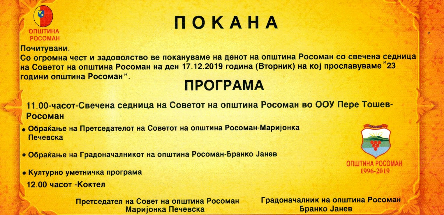 Со огромна чест и задоволство ве покануваме на денот на општина Росоман со свечена седница на Советот на општина Росоман на ден 17.12.2019 година (Вторник) со почеток од 11 часот во просториите на ООУ “Пере Тошев” – Росоман, заеднички да прославиме “23 години општина Росоман”.