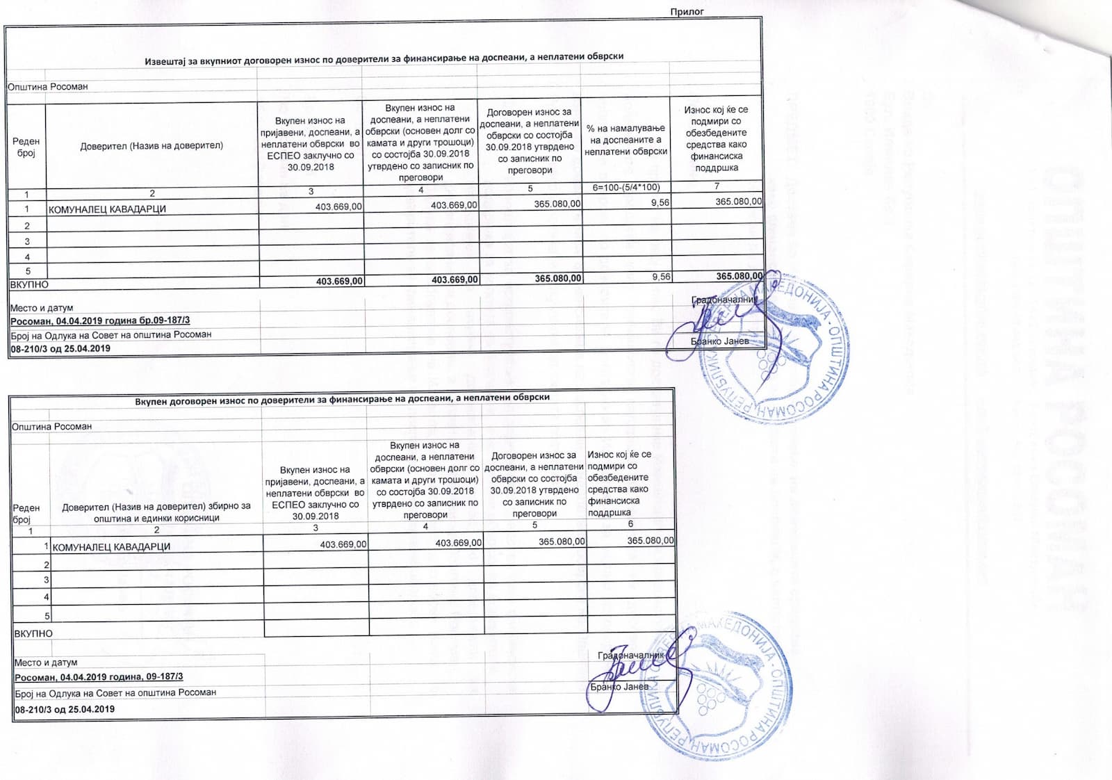 Извештај за вкупниот договорен износ по доверители за финансирање на доспеани, а не платени обврски на општина Росоман (Сл.Весник на РМ бр.209/2018), заклучно со Септември 2018 година.