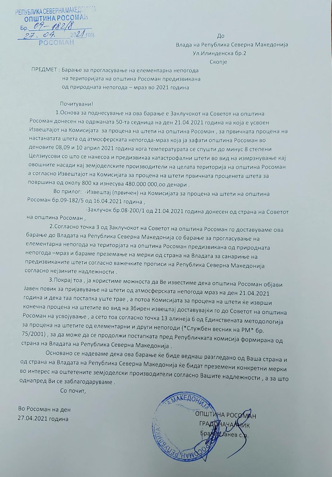 Општина Росоман достави барање до Владата на Република Северна Македонија за прогласување на елементарна непогода на територијата на општина Росоман предизвикана од природна непогода – мраз во 2021 година.