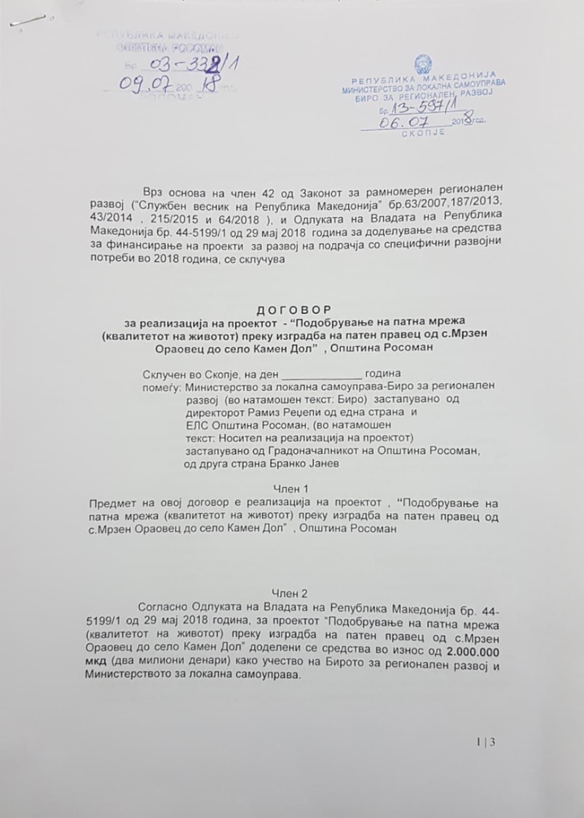 - Подобрување на патна мрежа (квалитетот на животот) преку изградба на патен правец од с.Мрзен Ораовец до с.Камен Дол (Општина Росоман) – во износ од 2 000 000 денари