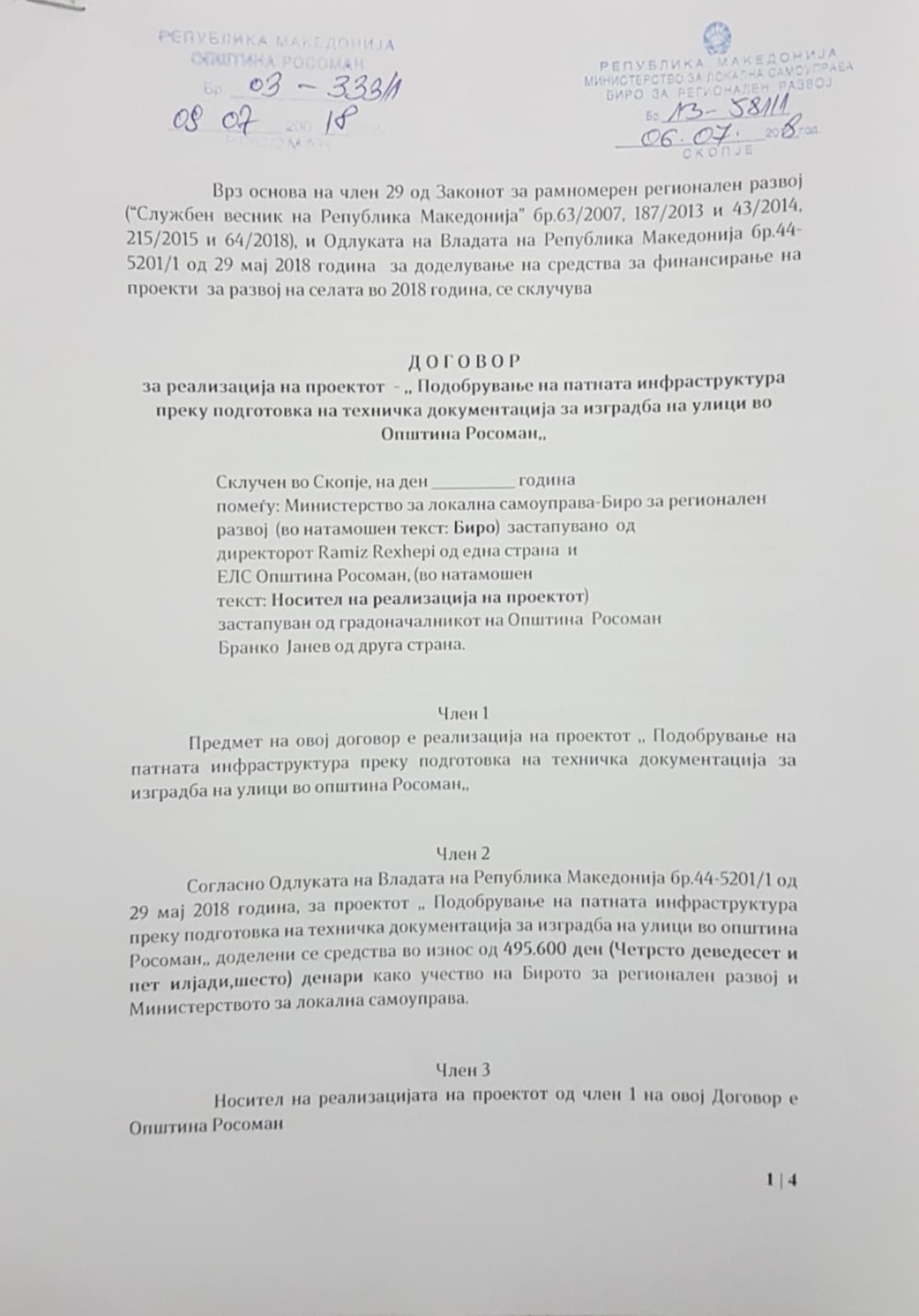 - Подобрување на патната инфраструктура преку подготовка на техничка документација за изградба на улици во општина Росоман во должина од 2500 метри – во износ од 495 600 денари
