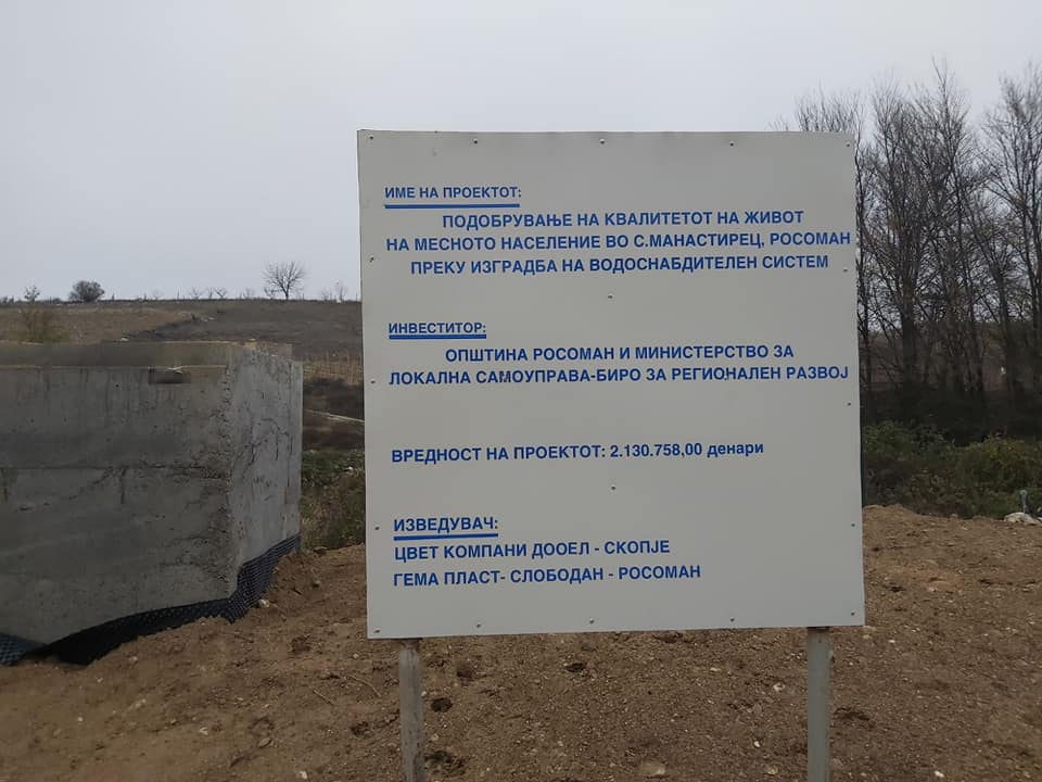 Завршен е проектот “Подобрување на животниот стандард преку изградба на водоснабдителен систем во с.Манастирец”. Проектот опфаќа дистрибуирање на вода за пиење преку доводен цефковод со должина од 1.6 км и резервоар за вода за пиење со волумен од 60 м3. Проектот е финансиран од страна на Бирото за Регионален развој и кофинансирано од страна на општина Росоман а е во износ од 2.130.758,00 денари.